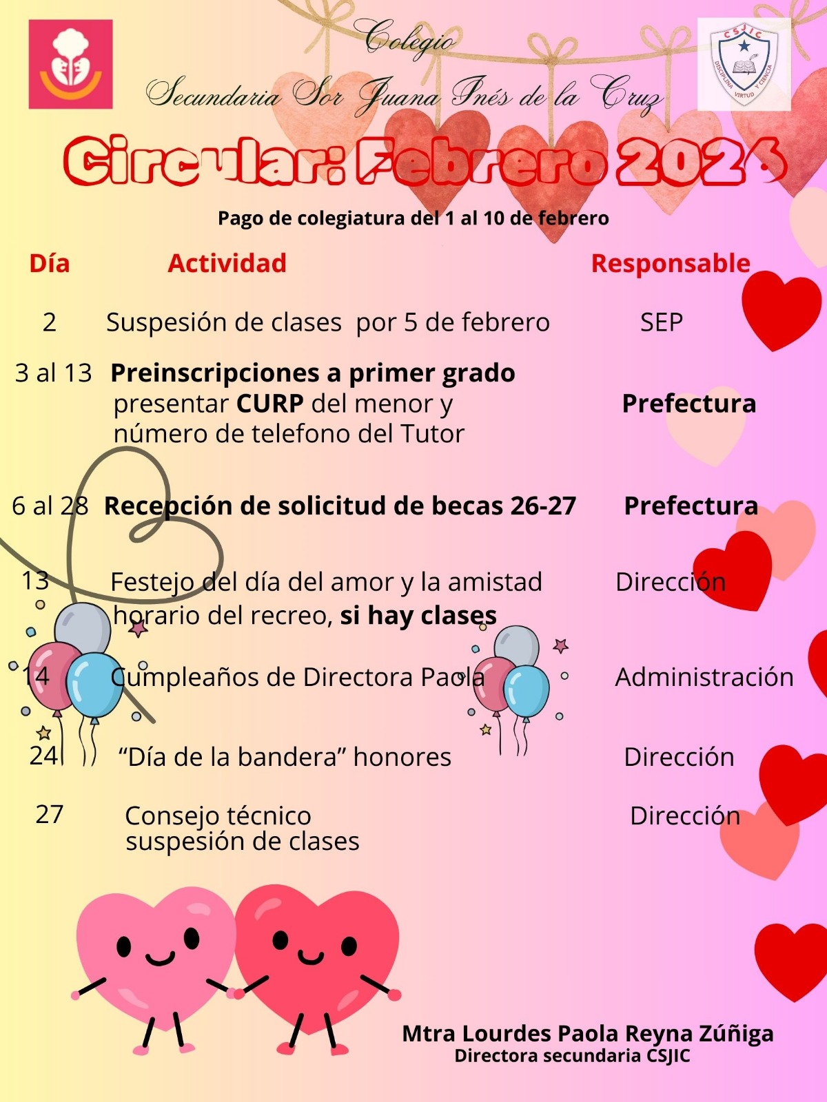 Conoce las actividades del mes de febrero: festejo del día del amor y la amistad el 13, día de la bandera el 24 con honores, recepción de solicitudes de becas 26-27, preinscripciones a primer grado del 3 al 13, y consejo técnico el 27. Pago de colegiatura del 1 al 10 de febrero.
